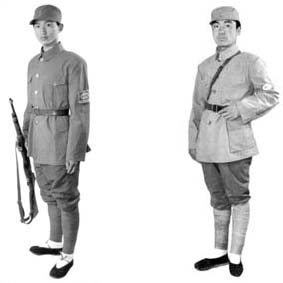 八路军军服(复制品)(左图) 新四军军服(复制品)(右图)