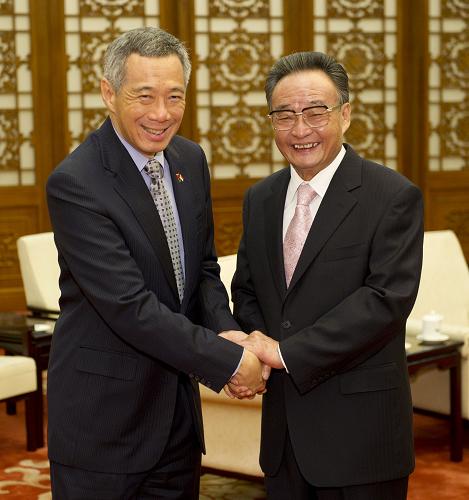 全国人大常委会委员长吴邦国7日在人民大会堂会见新加坡总理李显龙。