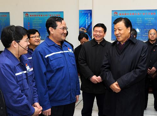 1月11日至14日,中共中央政治局常委、中央书记处书记刘云山在陕西延安、榆林两地就贯彻落实党的十八大精神、开展群众路线教育实践活动进行调研。这是1月14日,刘云山在榆林市延长油田20万吨醋酸项目调研时,同公司员工亲切交谈。